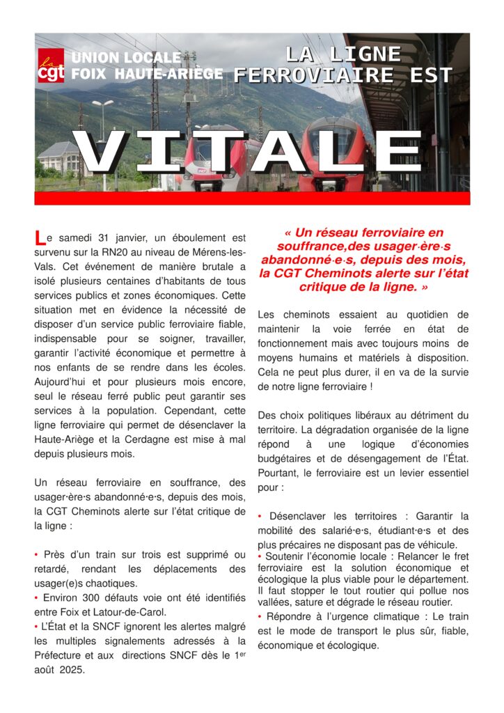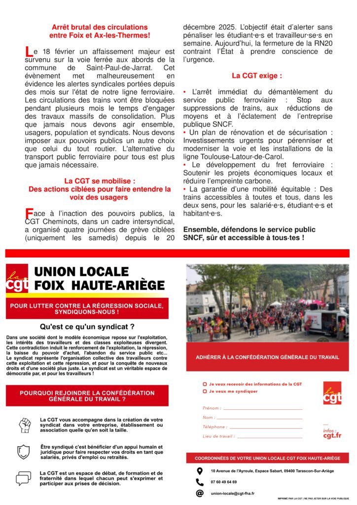 L’Union Locale CGT Foix Haute-Ariège s’est déployée avec détermination devant la gare de Foix pour dénoncer une situation inacceptable qui frappe durement les travailleurs et les habitants de notre territoire. Le 31 janvier dernier, un éboulement sur la RN20 à Mérens-les-Vals a brutalement isolé des centaines de personnes de leurs zones économiques et des services publics. Alors que le réseau ferré s’imposait de fait comme la seule alternative pour la population, un affaissement majeur est survenu le 18 février sur la voie ferrée près de Saint-Paul-de-Jarrat. Depuis ce 13 mars, qui marque la fin du dispositif exceptionnel de trains supplémentaires, les usagers doivent subir des trajets en bus de substitution. Les circulations ferroviaires sont en effet bloquées pour plusieurs mois, le temps d’engager des travaux massifs de consolidation.